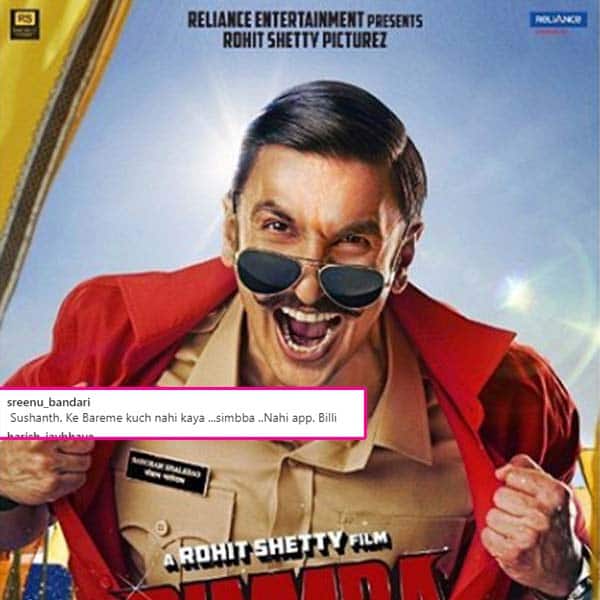 लेकिन जैसे ही रणवीर सिंह के इस पोस्ट को अपने इंस्टाग्राम पर शेयर किया वो ट्रोलिंग का शिकार हो गए है। रणवीर सिंह पर इंटरनेट यूजर्स सुशांत सिंह राजपूत के निधन के बाद चुप्पी बनाए रखने को लेकर ट्रोल कर रहे है। रणवीर सिंह की इस पोस्ट पर एक यूजर ने लिखा है, ‘सुशांत के लिए कुछ नहीं कहा... सिंबा नहीं बिल्ली...’ तो वहीं कुछ लोग सवाल उठा रहे हैं कि, ‘ये फिल्म सिनेमाघर में और सुशांत सिंह राजपूत की फिल्म दिल बेचारा डिजिटल पर ऐसा क्यों?’ जबकि कुछ लोग रणवीर सिंह को अपनी ओर से इस मुद्दे पर स्टैंड लेने की बात सुना रहे है। देखिए इंटरनेट यूजर्स के कैसे मिल रहे हैं रिएक्शन्स-।