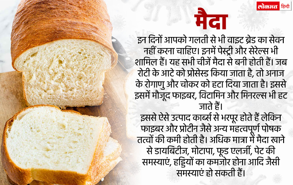इन दिनों आपको गलती से भी वाइट ब्रेड का सेवन नहीं करना चाहिए। इनमें पेस्ट्री और सेरेल्स भी शामिल हैं। यह सभी चीजें मैदा से बनी होती हैं। जब रोटी के आटे को प्रोसेस्ड किया जाता है, तो अनाज के रोगाणु और चोकर को हटा दिया जाता है। इससे इसमें मौजूद फाइबर, विटामिन और मिनरल्स भी हट जाते हैं।