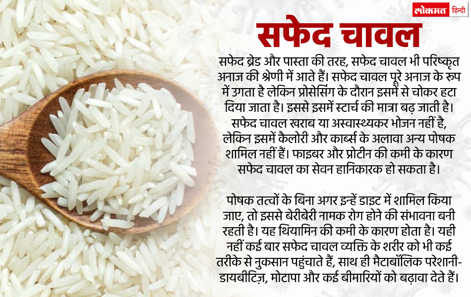 सफेद ब्रेड और पास्ता की तरह, सफेद चावल भी परिष्कृत अनाज की श्रेणी में आते हैं। सफेद चावल पूरे अनाज के रूप में उगता है लेकिन प्रोसेसिंग के दौरान इसमें से चोकर हटा दिया जाता है। इससे इसमें स्टार्च की मात्रा बढ़ जाती है। सफेद चावल खराब या अस्वास्थ्यकर भोजन नहीं है, लेकिन इसमें कैलोरी और कार्ब्स के अलावा अन्य पोषक शामिल नहीं हैं। फाइबर और प्रोटीन की कमी के कारण सफेद चावल का सेवन हानिकारक हो सकता है।