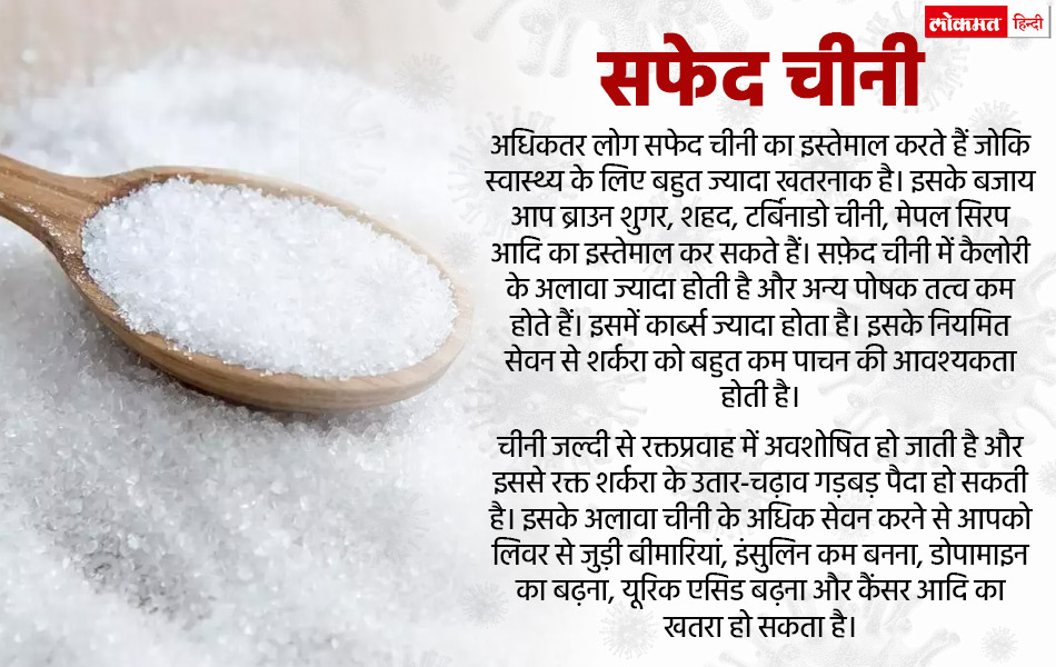 अधिकतर लोग सफेद चीनी का इस्तेमाल करते हैं जोकि स्वास्थ्य के लिए बहुत ज्यादा खतरनाक है। इसके बजाय आप ब्राउन शुगर, शहद, टर्बिनाडो चीनी, मेपल सिरप आदि का इस्तेमाल कर सकते हैं। सफ़ेद चीनी में कैलोरी के अलावा ज्यादा होती है और अन्य पोषक तत्व कम होते हैं। इसमें कार्ब्स ज्यादा होता है। इसके नियमित सेवन से शर्करा को बहुत कम पाचन की आवश्यकता होती है।