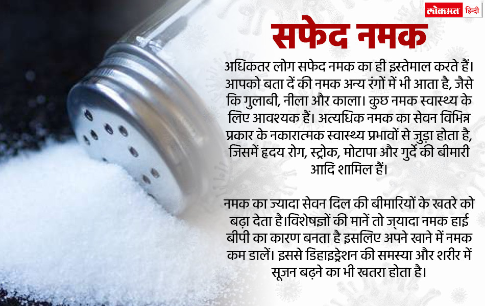 अधिकतर लोग सफेद नमक का ही इस्तेमाल करते हैं। आपको बता दें की नमक अन्य रंगों में भी आता है, जैसे कि गुलाबी, नीला और काला। कुछ नमक स्वास्थ्य के लिए आवश्यक हैं। अत्यधिक नमक का सेवन विभिन्न प्रकार के नकारात्मक स्वास्थ्य प्रभावों से जुड़ा होता है, जिसमें हृदय रोग, स्ट्रोक, मोटापा और गुर्दे की बीमारी आदि शामिल हैं।