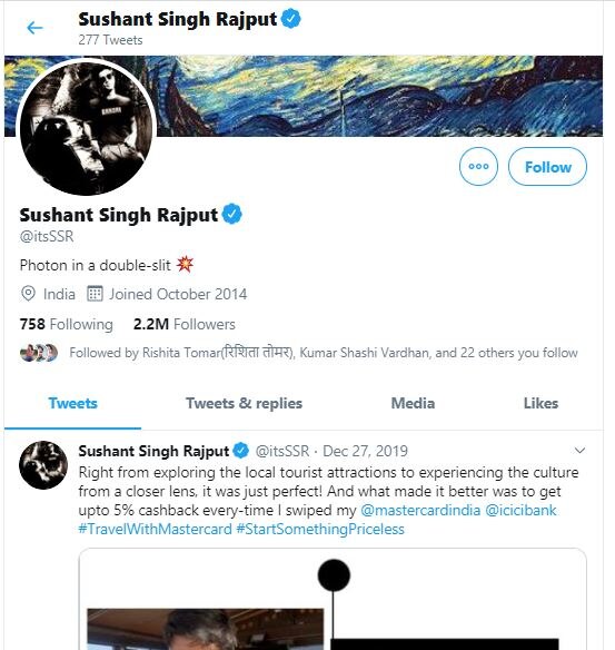 https://twitter.com/itsSSR सुशांत का ट्विटर अकाउंटर देखिए. उनके ट्विटर पर आखिरी ट्वीट 27 दिसंबर 2019 का नजर आ रहा है. इस ट्वीट में एक विज्ञापन का जिक्र था. ये आखिरी ट्वीट उनकी मौत से करीब छह महीने पहले का है. क्या छह महीने तक सुशांत ने कोई ट्वीट ही नहीं किया था या फिर इसमें कुछ गड़बड़ है.